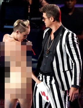 Tapi, ada satu kejadian yang belakangan juga "menyusul' jadi perbincangan. Kejadian tersebut adalah saat Miley menyentuh kemaluan pasangan duetnya, Robin Thicke.
