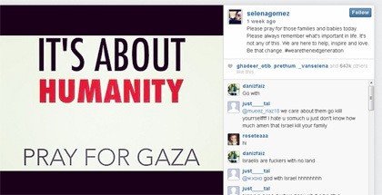 Dalam akun Instagram-nya, Selena mengunggah foto bertuliskan 'Pray For Gaza'. Ia mengecam serangan yang menimbulkan ratusan korban jiwa dari warga sipil Palestina, termasuk anak-anak dan wanita.