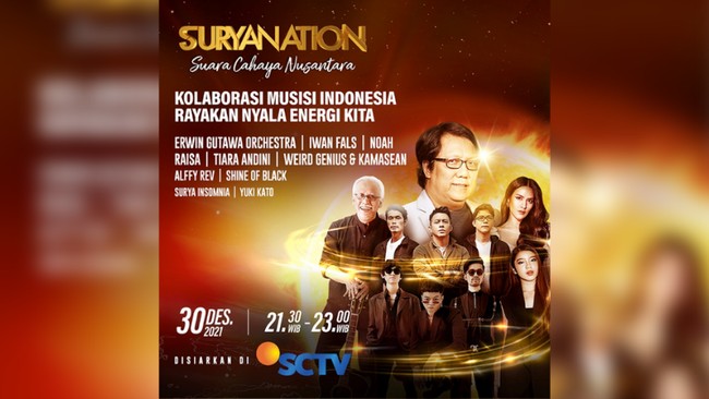 Suryanation Suara Cahaya Nusantara bisa disaksikan pada 30 Desember 2021 pukul 21.30 di SCTV. Jika terlewat, jangan khawatir karena ada rerun acara yang akan tayang pada Sabtu, 1 Januari 2022 pukul 21.30-23.00 WIB di Indosiar.
