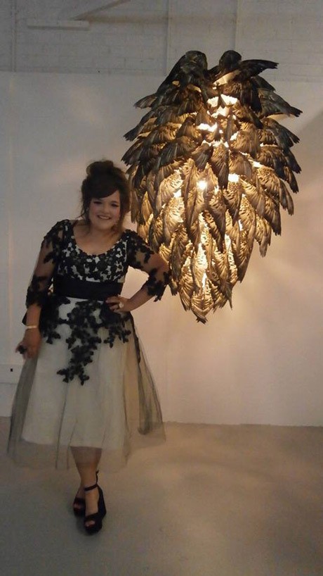 Sebuah instalasi berjudul 'Flutter' yang dibuatnya tahun lalu mengubah benda sehari-hari menjadi lampu pijar yang indah. Desain rumit ini laiknya sayap-sayap burung merpati yang sedang terbang dan berwarna hitam.