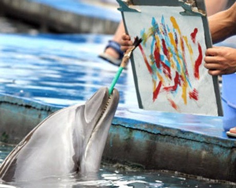Sebuah lukisan kreasi dari lumba-lumba tersebut kini dipamerkan di Taman Sealife, China.