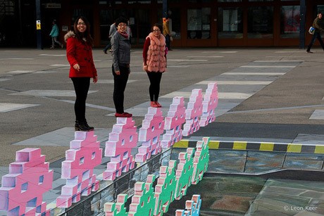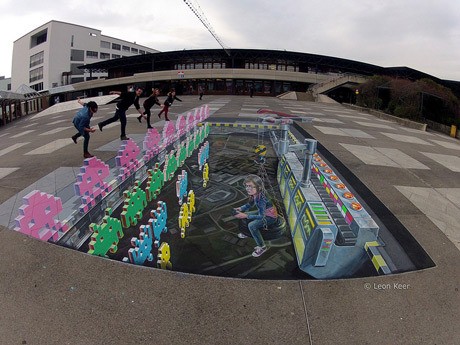 Si pelukisnya Leon Keer, memberi judul karyanya ini 'Space Invander'. Istilah ini 'Space Invander' sendiri awalnya adalah game yang dibuat oleh Tomohiro Nishikado pada akhir tahun 1970-an. Namun Keer menggunakan istilah itu sekaligus untuk menyindir semakin minimnya lahan bermain untuk anak-anak.