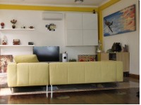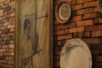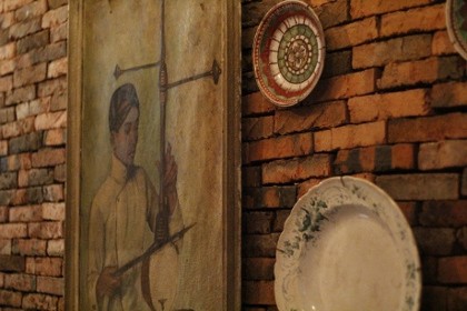 Ia juga memajang lukisan pria yang mengenakan pakaian adat Jawa, ini dipercantik dengan hiasan piring dan frame untuk cermin. Kesan antik dan tradisional tak terelakkan. Ruang ini nampaknya hanyalah sebuah ruang singgah, atau tempat di mana para penghuninya berlalu lalang. Karena di ujung ruang berlantai terakota ini, ada deretan anak tangga beralas papan kayu.