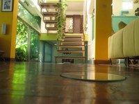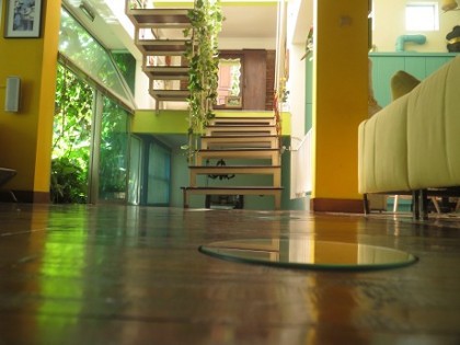 "Di bawah itu pakai pintu kaca, karena kan memang lantai dasar cuma lorong saja. Sebelumnya dulu pakai pintu gebyok 16 meter," ujarnya. Pintu itu ia dapatkan dari bangunan lama rumahnya, yang ia rombak menjadi rumahnya sekarang ini.