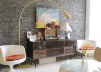 Halaman depan rumahnya diberi sudut khusus untuk tanaman hijau tumbuh berkembang. Dari pagar, kita akan masuk ke garasi mobilnya yang memanjang ke arah belakang. Memasuki ruang tamu, kita akan melalui sebuah pintu kaca transparan dengan kursi dan meja dalam ruang yang nampak bak koridor. Karakter bangunannya tampak alami sekaligus etnik dengan sentuhan elemen batu yang saling menumpuk di dindingnya.