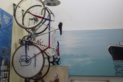 Di kamarnya juga terdapat sepeda yang bertengger cantik di dinding merahnya. Begitu juga di ruang tengahnya. Empat sepeda lainnya terparkir rapi di lantai dasar rumahnya, ini adalah sepeda-sepeda yang masih rutin ia pakai pada hari Sabtu atau Minggu.