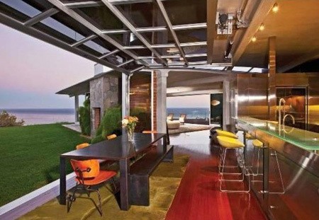 Tak heran ada banyak kekayaan elemen yang dipadu-padankan oleh tunangan Angelina Jolie ini. Bagian lantainya dilapisi bambu dengan warna coklat kemerahan. Bagian meja saji makanan berhadapan langsung dengan kaca jendela yang lebar tanpa dinding penghalang.