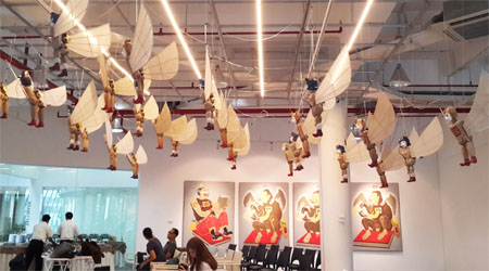 Selain itu, dalam pamerannya yang memajang 84 karya itu terlihat paling banyak menggunakan sayap. Seperti yang terdapat di lantai 1 dan 2 Art:1 New Museum, instalasi seperti anak kecil terbang dengan sayapnya menghiasi langit-langit galeri.