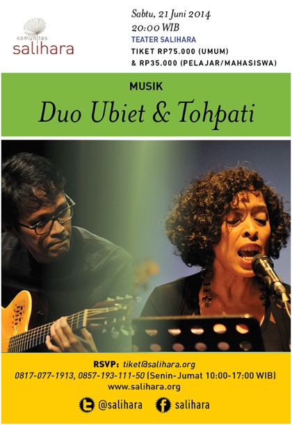 Agenda ini berlangsung di Teater Salihara, Sabtu, 21 Juni 2014, pukul 20:00 WIB. Dengan harga tiket Rp75 ribu (umum) dan Rp 35 ribu (pelajar/mahasiswa) dapat dipesan melaluiΒ tiket@salihara.org, atau kontak 021-789-1202, 0857-193-111-50, 0817-077-1913.Β