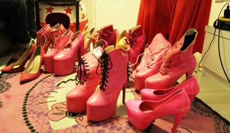 "Aku memang lebih angkat warna pink-nya sih sekarang, karena memang aku suka warna pink," ujarnya seraya mengeluarkan berbagai koleksinya. Salah satu koleksi pink yang mendominasi adalah sepatu. Ia kemudian menjejerkan koleksinya ke ruang tengah apartemennya. Rata-rata model sepatunya itu berhak tinggi belasan senti.