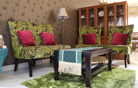 Ruang tamunya ini bergaya klasik namun tidak terasa berat. Ia padukan wallpaper bernuansa hijau dengan motif yang lembut, ditambah dengan kursi-kursi bepotongan ringan dengan motif gulir serba hijau.