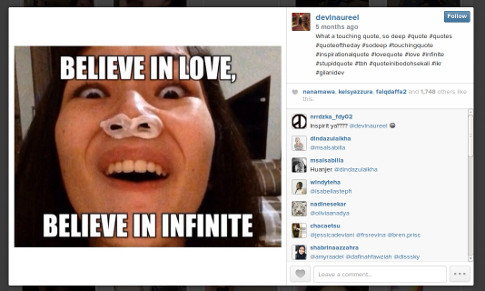 Namun itulah yang terjadi di akun instagramnya. Wanita berusia 18 tahun ini sudah memposting sebanyak 311 foto dan video dirinya. Pengikutnya ada 104 ribu. Mayoritas ia memposting selfie dan video konyol. Bahkan Devina juga menampilkan wajah terjelek yang dimilikinya. Seperti dalam video yang diunggahnya 4 bulan lalu. Di salah satu adegan, ia menyatukan alisnya dengan pensil alis.