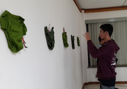 Di sekeliling kedua pria tersebut terdapat belasan 'kolor ijo' dipamerkan di depan Hall Japan Foundation Jakarta Selatan. Ada yang berwana hijau tua namun ada juga yang terang. Di antara kolor hijau tersebut terselip gambar-gambar kaki pria dengan high heels.