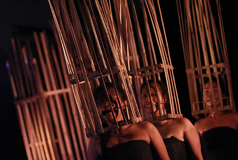 Di sisi lain panggung, tiga wanita mengangkat kurungan bambu. Mereka mendorong, membanting, lalu masuk ke dalamnya. "Waktu... manusia...kala. Waktu...manusia...karang. Waktu..manusia..sekarang," teriak mereka berulang-ulang.