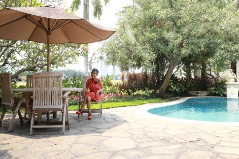 Jika duduk di atas bangku panjang bernuansa etnik dan berwarna merah tersebut, maka suasana asri karena rindangnya pepohonan dan sejuknya udara di sana akan menambah kenyamanan tinggal di istana megah tersebut.