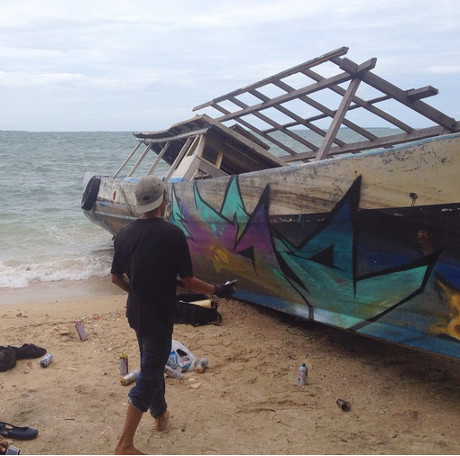 "Gambarnya jalan-jalan, bergerak. Nggak kayak di tembok, cuma ada di situ saja. Diam, dan nggak bergerak," kata seniman yang mulai ngebom sejak 2008 lalu.