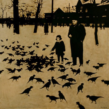 Dalam lukisannya tampak seorang pria dan gadis kecil berhenti sejenak untuk membuang sisa roti di sebuah taman.