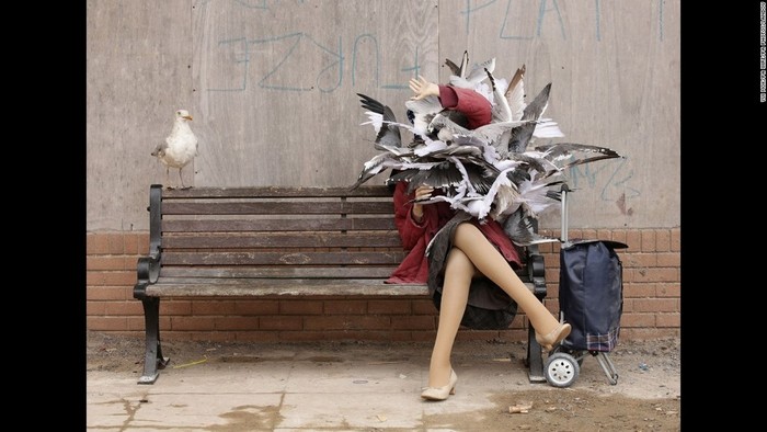 Lebih dari 50 seniman dari 17 negara ikut berpameran di 'Dismaland' ala Banksy. Salah satu karya instalasi dan grafiti Banksy adalah seorang wanita yang tengah diserang oleh burung seagulls. Ya, Anda bisa duduk di sampingnya dan berfoto bersama wanita tersebut.