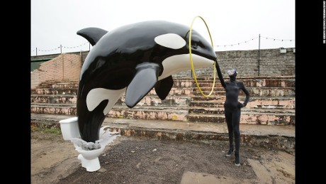 Sama seperti taman bermain, salah satu instalasi yang fantastis adalah paus yang keluar dari toilet. Ditambah dengan patung perenang.