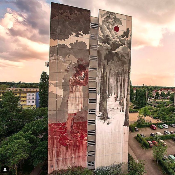 Karya yang menyimbolkan penderitaan pengungsi Suriah dilukis di dua sisi bangunan besar. Satu sisi menggambarkan seorang gadis muda yang mengenakan gaun tidur dan bernoda merah. Di dindingnya pun digambar dengan banyak warna merah seakan-akan 'berdarah'.
