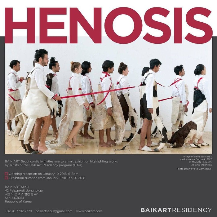 Pameran seni kolektif bersama seniman-seniman yang tergabung dalam program residensi itu diberi judul 'Henosis' dan dibuka pada 10 Januari 2018. Karya 'Dogwalk' pernah ditampilkan Mella untuk First Sight kedua Museum MACAN September lalu.