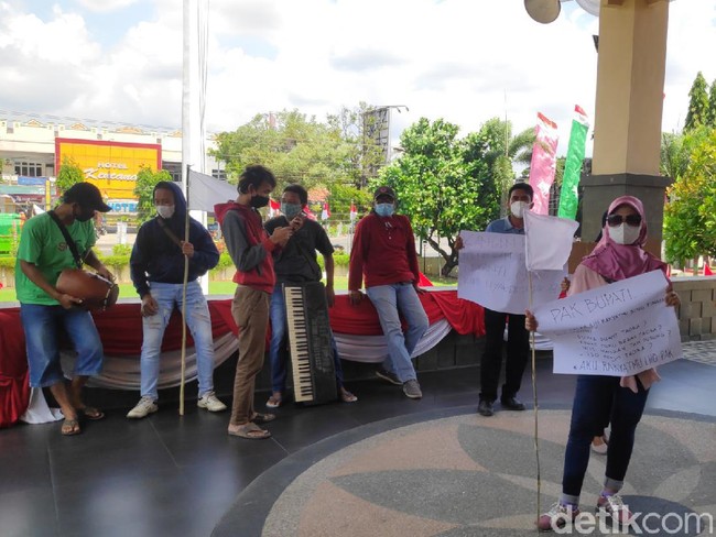 Sekelompok seniman yang menamakan diri Komunitas Buruh Seni di Rembang menggelar aksi jalan kaki pada Senin (9/8/2021) siang. Namun, saat hendak menemui Bupati di kantornya, mereka ditolak.