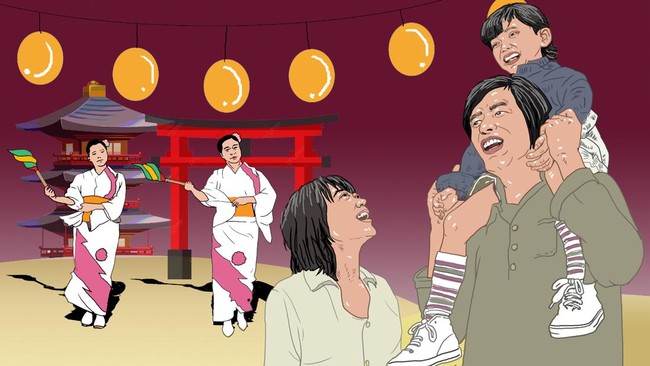 Natsuko bukan main senangnya ketika mengunjungi festival Obon pertamanya. Istriku mendandaninya dengan yukata berwarna biru dengan corak rumput-rumput dan sebuah bulan purnama yang menggambarkan suasana musim panas-jika yukata itu dapat mengeluarkan suara, pastilah akan terdengar suara embusan angin dan bunyi krik krik krik-dan obi berwarna kuning.