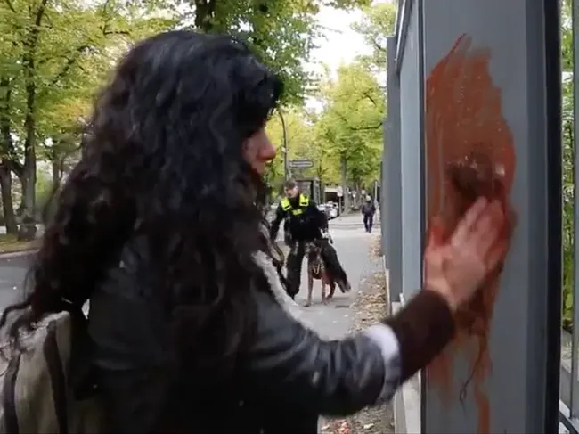 Dalam video pertunjukan yang diposting sang seniman ke media sosial, dia tampak mengoleskan campuran dari apa yang digambarkan sebagai rambut, pacar, dan darah menstruasi di gerbang dekat kedutaan. Tak berapa lama kemudian, dua polisi pun tiba.