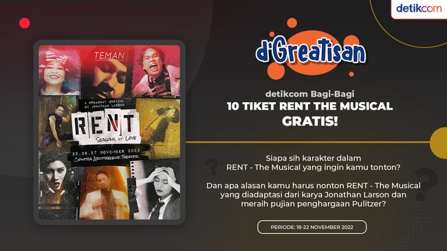 Bagi kamu pencinta seni, pekan depan RENT: The Musical segera menyapa penggemarnya. Bagi detikers, yang belum memiliki tiketnya, detikcom mau bagi-bagi tiket gratis.