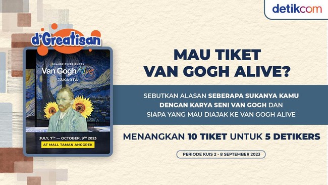 Selanjutnya detikers cukup jawab pertanyaan di kolom komentar artikel ini. Sebutkan alasan seberapa sukanya kamu dengan karya seni Van Gogh dan siapa yang akan kamu ajak ke Van Gogh Alive.