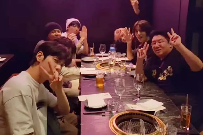Sederet gelas dan minuman sudah tersaji di hadapan mereka. Tapi sebelum menyantap makanan, para artis HYBE dan sang bos bergaya di depan kamera terlebih dulu.