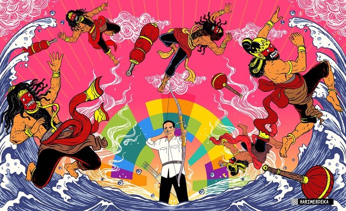 Uniknya gambar yang didominasi oleh latar langit berwarna pink dan gelombang lautan itu juga menampilkan lima buto yang 'terpental'. Jokowi pun digambarkan gagah dan mengenakan kemeja putih seperti kebiasannya.
