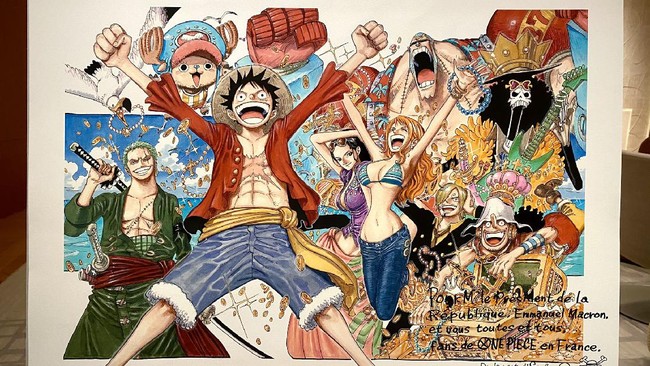 "Karya tersebut didedikasikan untuk Presiden Prancis dan semua penggemar manga One Piece di negara tersebut," tulis Eiichiro Oda dalam ilustrasi tersebut.