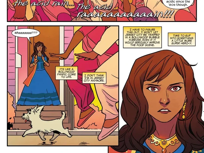 "Apa??? Ini seperti film Bollywood yang datang ke dalam kehidupanku. Saya tidak terpikir seperti berada di kota Jersey lagi," ucap Kamala Khan bingung dengan kondisi di depan matanya tersebut.