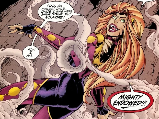 Alasannya, Mighty Endowed punya kekuatan yang paling aneh dan dianggap tidak patut. Mighty Endowed merupakan villain dari komik DC yang memiliki kekuatan menghipnotis orang-orang lewat payudaranya.