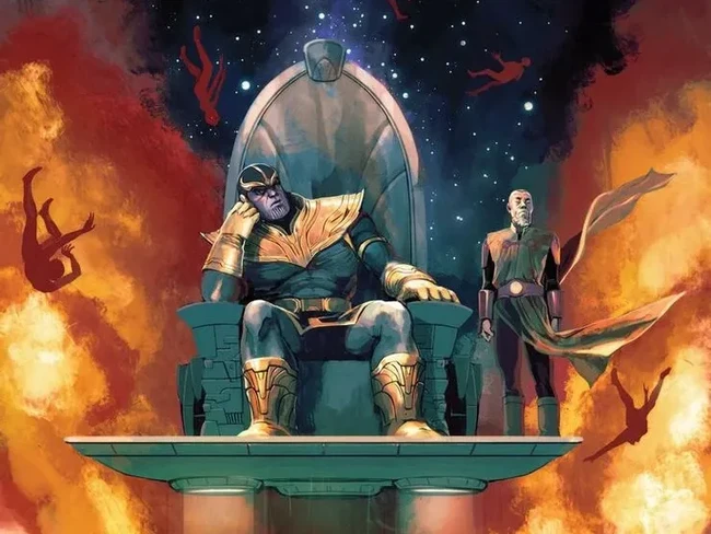 Ada juga Thanos yang duduk di atas tumpukan tengkorak lalu menjentikkan jarinya dengan kemampuan batu permata Infinity.