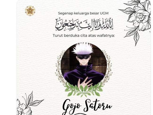 "Siapa yang jadi janda abis Gojo meninggal? Cung @ugm_fess," cuit salah seorang netizen disertai flyer ucapan duka.
