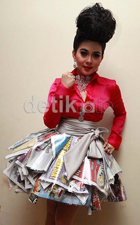 "Rok aku dibuat pakai koran-koran. Idenya aku sama Hengky Kaliwarang. Award kan selama ini blink-blink, gaun panjang gitu. Nah aku inginnya yang lebih sesuatu," ujarnya saat ditemui di TMII, Jakarta Timur, Jumat (30/11/2012) malam.