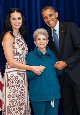 "May I exclusively present what might be the cutest photo ever taken: Me, Gma & POTUS! Happy voting tomorrow!" tulis Katy beserta foto dirinya, sang nenek dan Presiden Obama sedang tersenyum ke kamera.
