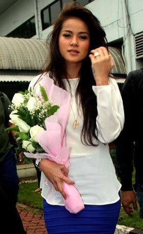 Olla terlihat meneteskan air mata usai memandu acara itu. Ia mengaku terharu saat Aufar memberinya bunga.