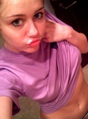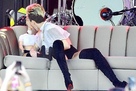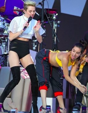 Jika tadi 'hanya' memukul bokong, kini lebih 'nakal'. Miley mencium payudara penarinya.