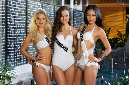 Whulan berpose bersama Miss Finlandia dan Miss Lithuania di sela-sela sesi pemotretan untuk koleksi 2014 Yamamay For Miss Universe di Crowne Plaza Moscow World Trade Centre.