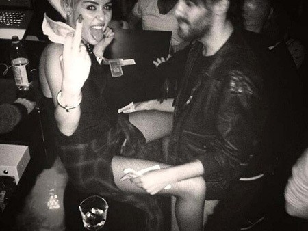 Di foto bernuansa hitam-putih itu, Miley terlihat duduk di atas meja bar di depan teman prianya sambil memegang uang.