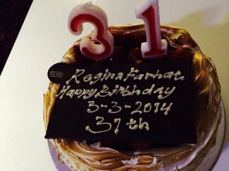 Namun ada yang janggal dalam kue ulang tahun tersebut. Dalam kue tersebut tertulis nama 'Regina Farhat'.