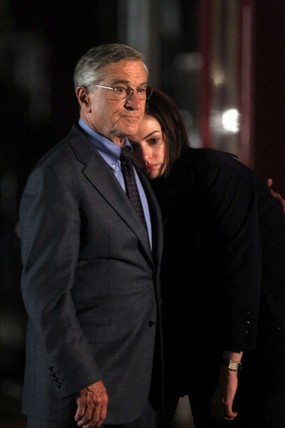 Aktor senior Robert DeNiro dan Anne Hathaway tertangkap kamera saat melakukan syuting film terbaru mereka 'The Intern' di New York. 'The Intern' merupakan film komedi yang disutradarai oleh Nancy Meyers. (foto: Getty)
