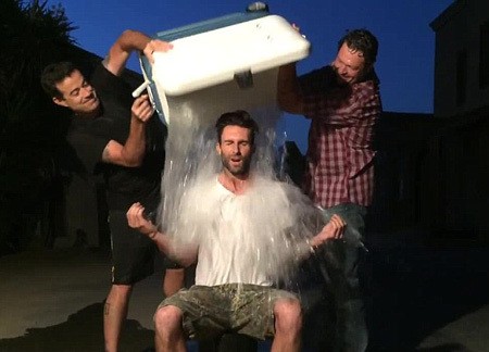 Vokalis Maroon 5 Adam Levine nampak diguyur air es oleh dua rekannya.
