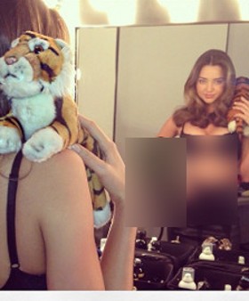 Model asal Australia Miranda Kerr menghadap kaca sembari menaruh boneka harimau di pundaknya.