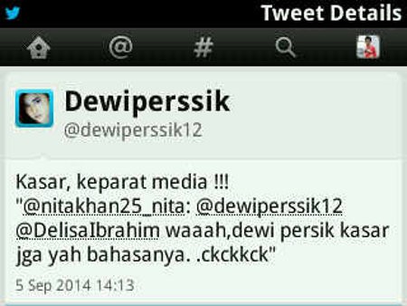 "βKasar, keparat media!!! @nitakhan25_nita : @dewiperssik12 @DelisaIbrahim waaah, dewi persik Kasar jga yah bahasanya..ckckkck", tambah kicau Dewi pada (5/9/2014) di jejaring sosial Twitter.