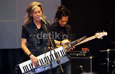Tak berekspresi, wajah pelantun 'Sakura' itu terlihat datar. Rambutnya yang gondrong sebahu dan beruban, terlihat menutupi sebagian wajahnya. Fariz pun terlihat menundukkan wajahnya.