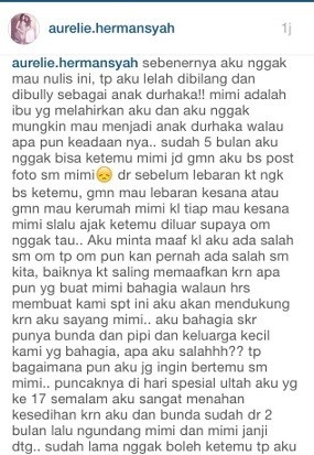 "Sebenarnya aku nggak mau nulis ini, tp aku lelah dibilang dan dibully sebagai anaka durhaka!! mimi adalah ibu yg melahirkan aku dan aku nggak mungkin mau menjadi anak durhaka walau apa pun keadaannya... sudah 5 bulan aku nggak bisa ketemu mimi jd gmn aku bs post foto sama mimi dr sebelum lebaran kt ngk bisa ketemu," tulis Aurel dalam akun Instagram miliknya, Minggu (30/8/2015).